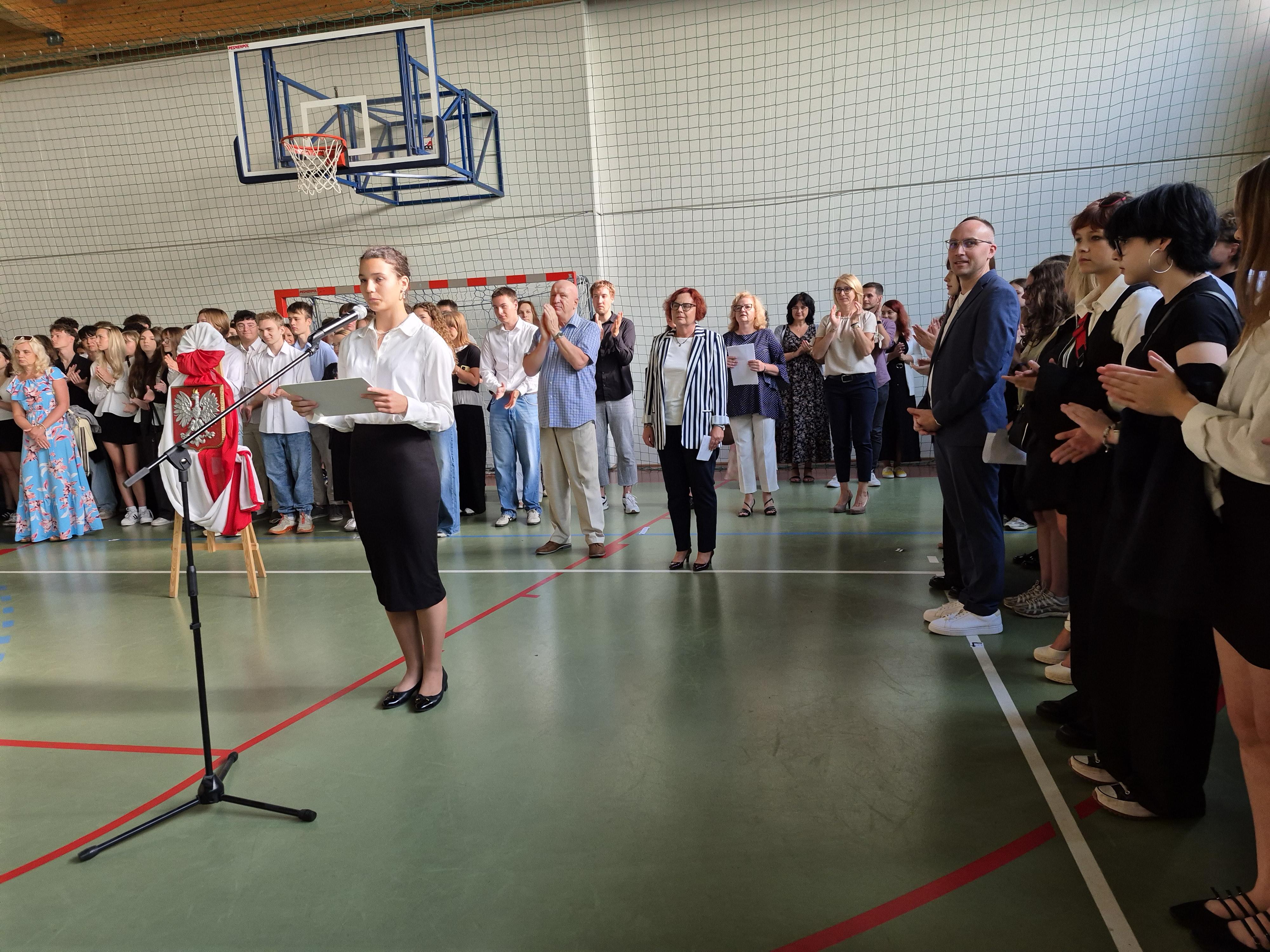 Głos zabrała Pani Dyrektor, która w imieniu własnym oraz wszystkich nauczycieli powitała uczniów po wakacyjnej przerwie. Życzyła wszystkim udanego roku szkolnego – pełnego wyzwań, zaangażowania, sukcesów i wzajemnej życzliwości.