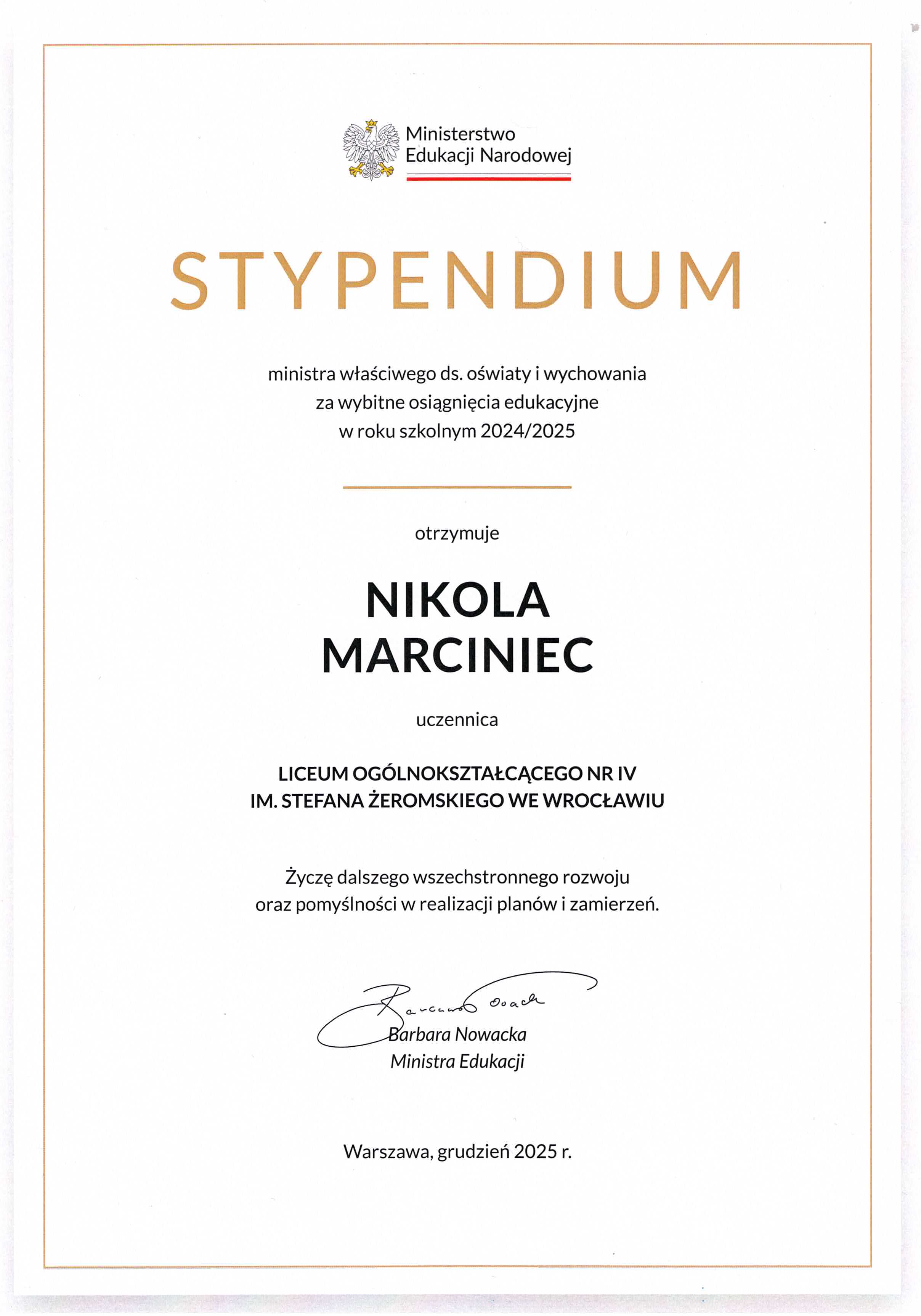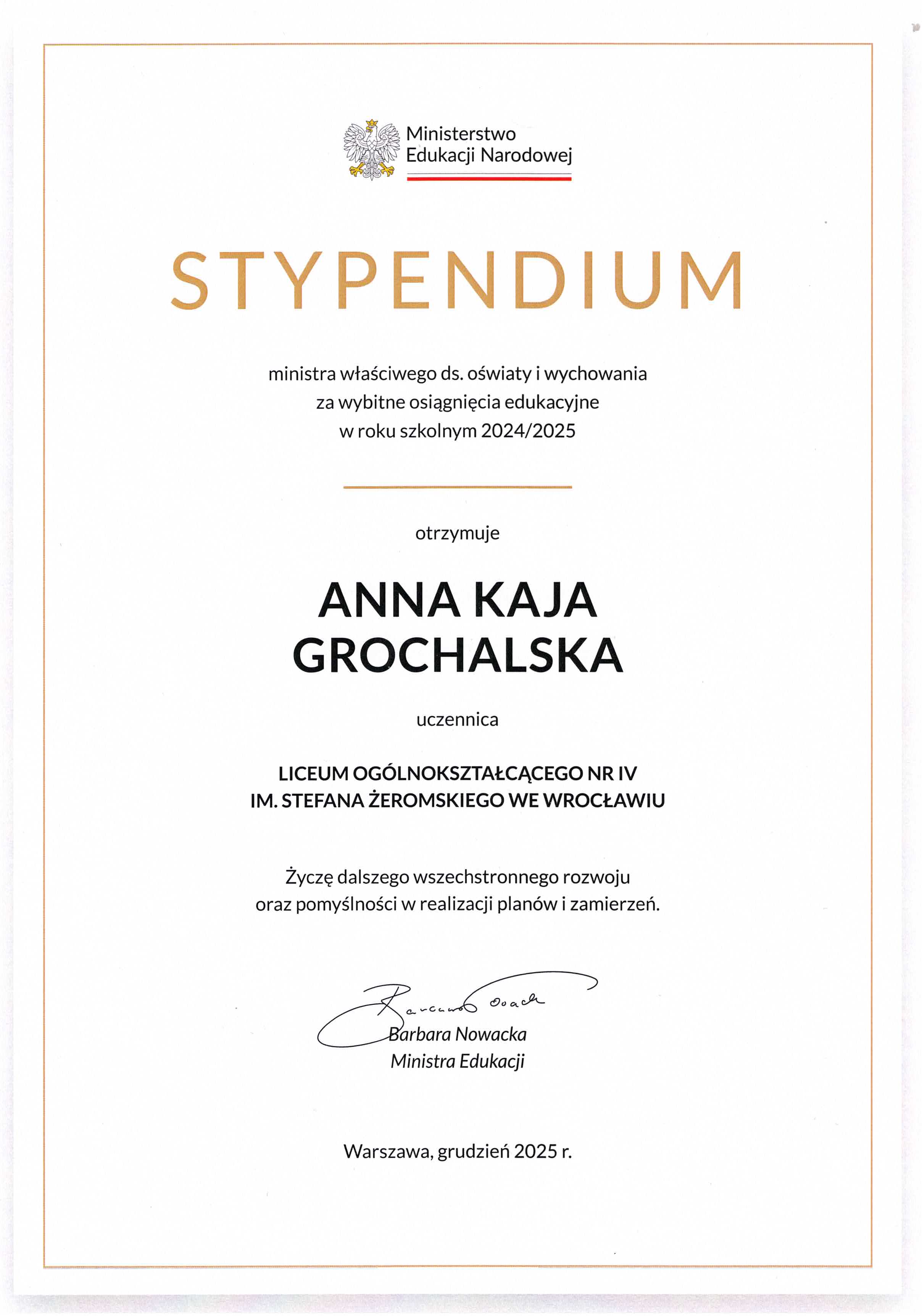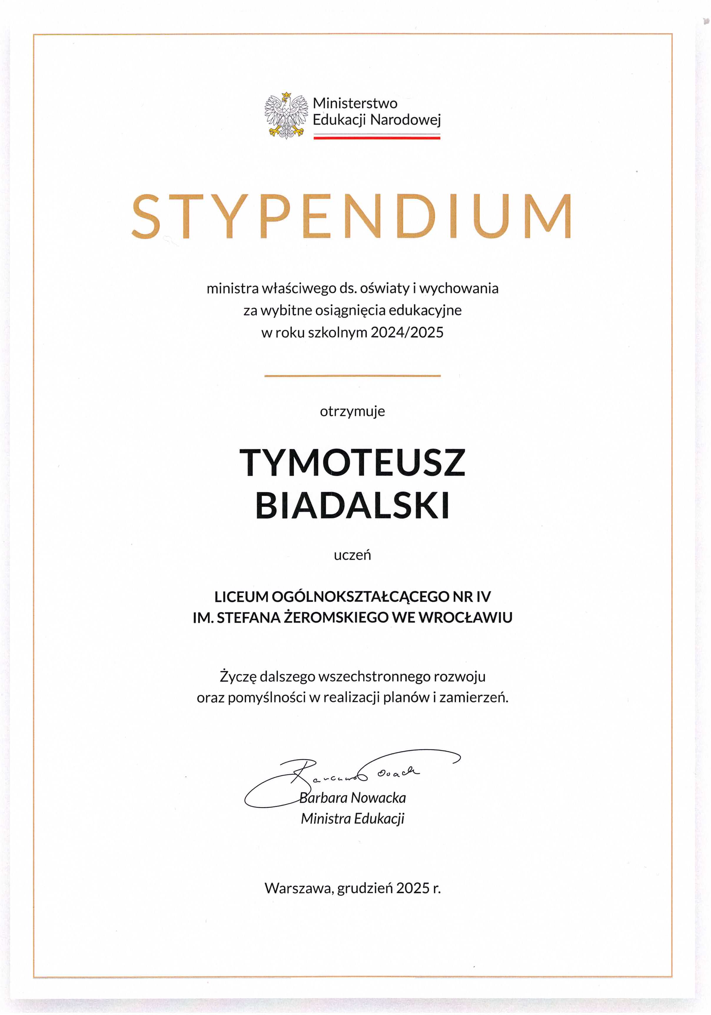 Decyzją ministra właściwego ds. oświaty i wychowania Tymoteusz Biadalski, Anna Grochalska i Nicola Marciniec otrzymali stypendium za wybitne osiągnięcia sportowe w roku szkolnym 2024/2025.